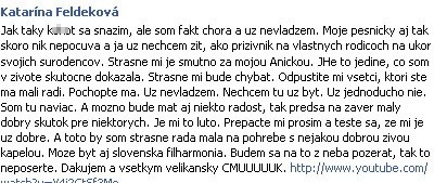 "Jak taký ko**t sa snažím, ale som fakt chorá a už nevládzem," takto začala svoj status na Facebooku Katarína Feldeková. Šansónová speváčka sa vyjadrila, že jej pesničky nik nepočúva a nechce ako príživník rodičov na úkor svojich súrodencov. Vyjadrila sa aj na adresu svojej 9-ročnej dcéry Aničky. "Strašne mi je smutno za mojou Aničkou. Je to to jediné, čo som v živote skutočne dokázala. Strašne mi bude chýbať," uviedla Katka.