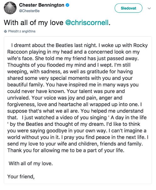 Chester Bennington sa s jeho úmrtím nevedel vyrovnať a i práve to mohol byť spúšťač neblahých emócií následne vedúcich k suicidálnym sklonom. Nezanedbateľný je i fakt, že Chester sa obesil 20. júla, presne na narodeniny jeho kamaráta. Z jeho posledného odkazu, ktorý venoval na sociálnej sieti Twitter práve Chrisovi, mrazí.
