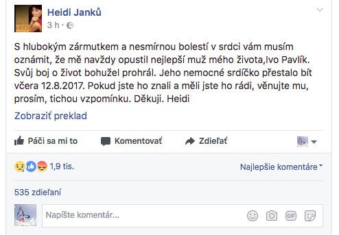 "S hlbokým zármutkom a nesmiernou bolesťou v srdci vám musím oznámiť, že ma navždy opustil najlepší muž môjhoživota, Ivo Pavlík. Svoj boj o život prehral. Jeho choré srdce prestalo biť 12.8.2017. Ak ste ho mali radi a poznali ste ho, venujte mu, prosím, tichú spomienku. Ďakujem. Heidi," napísala speváčka na sociálnej sieti Facebook.