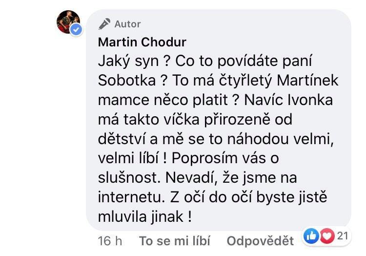 Martin, ako pravý džentlmen, si svoju partnerku patrične obránil a neznámu pani rýchlo schladil. "Aký syn? O čom to hovoríte? To má štvorročný Martinko niečo platiť svojej mame? Navyše, Ivonka má takéto viečka prirodzene od detstva, a mne sa to náhodou veľmi, veľmi páči! Poprosím vás o slušnosť. Nevadí, že sme na internete. Z očí do očí by ste hovorili inak," rozhorčil sa inokedy pozitívne naladený a usmiaty spevák. Navyše, jeho partnerke Ivone by málokto tipoval blížiacu sa päťdesiatku, a tak je pravdepodobné, že "milá" pani si jednoducho len potrebovala vyliať žlč.