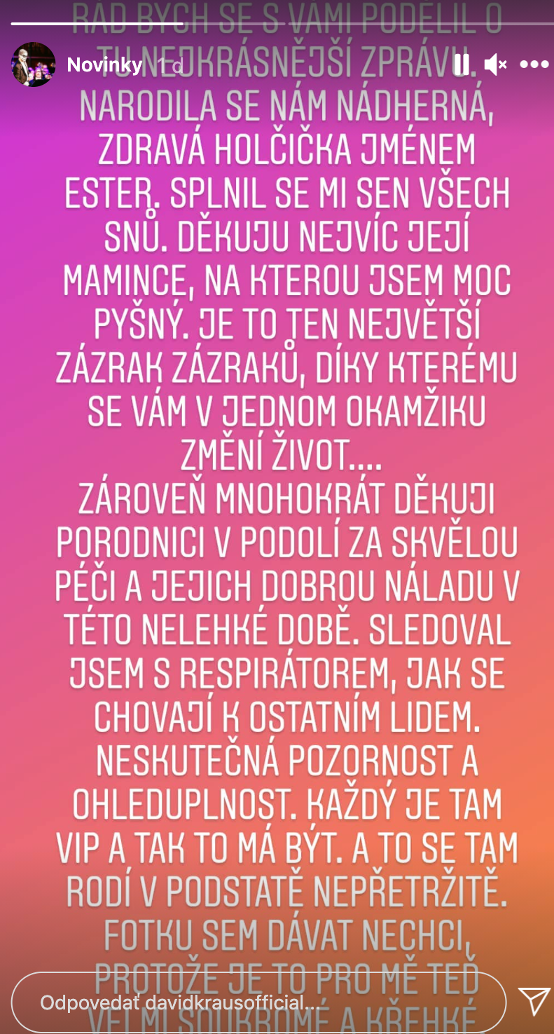 Malá Ester sa narodila v známej pražskej pôrodnici v neľahkej dobe pandémie. "Zároveň mnohokrát ďakujem pôrodnici v Podolí za skvelú starostlivosť a ich dobrú náladu v tejto neľahkej dobe. Sledoval som s respirátorom, ako sa chovajú k ostatným ľuďom. Neskutočná pozornosť a ohľaduplnosť. Každý je tam VIP a tak to má byť. A to sa tam rodí v podstate nepretržite," vyjadril David s úctou svoj obdiv k práci personálu.