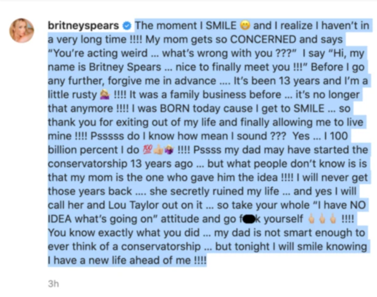 Svoju mamu potom Spears oslovila aj priamo, pričom svojho otca označila v podstate za hlupáka: "Ty presne vieš, čo si urobila... môj otec nie je dosť inteligentný na to, aby niekedy čo i len pomyslel na opatrovníctvo. Skôr než budem pokračovať, vopred mi odpusťte. Je to už 13 rokov a som trochu zhrdzavená! Predtým to bol rodinný podnikuž , to tak nie je! Dnes som sa NARODILA, lebo sa môžem USMIAŤ. Takže ďakujem, že ste odišli z môjho života a konečne ste mi umožnili žiť svoj," odkázala svojim rodičom. Rodina ju vraj "zranila hlbšie" a s ďalšími odhaleniami chce na Instagrame pokračovať v jednom príspevku za druhým, aby sa všetci dozvedeli celý príbeh.