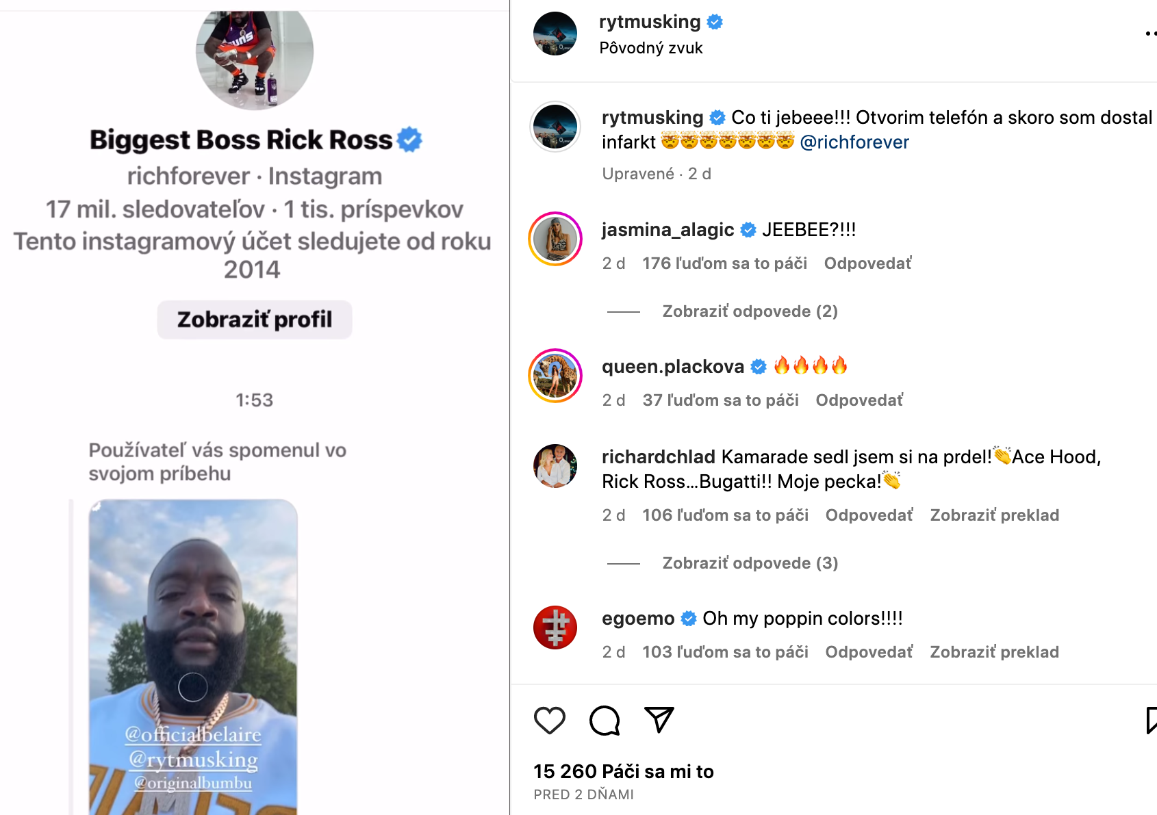 Rytmus sa sotva zmohol na zmysluplnú vetu v reakcii na video, ktoré Rick Ross zverejnil v instastories. "Čo ti je*eee!!! Otvorím telefón a skoro som dostal infarkt," napísal k zdieľanému videu. Jeho manželka Jasmina sa v šoku zmohla na ešte menej slov, vlastne len jediný vulgarizmus.