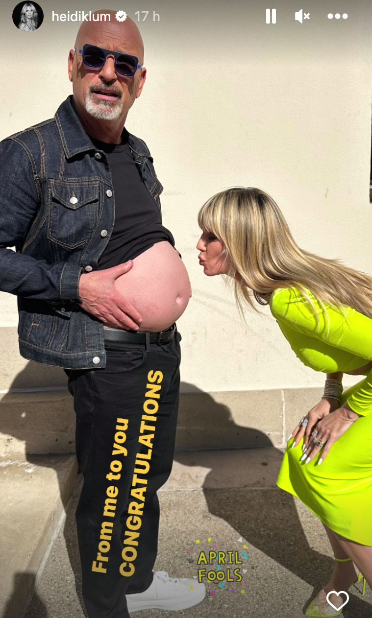 No hneď druhá fotka ďalšieho kolegu z poroty talentovej súťaže už dáva na známosť, že to zrejme tak úplne nebude pravda. Aj on totiž odhalil svoje vypuklé brucho a tentokrát mu ho bozkáva Heidi. No k fotke je pripojený okrem gratulácie aj nápis - 1.apríl! A tak sa zrejme zázrak nekoná a možno to je pre Heidi pomerne trpký vtip...