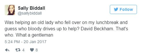Sally Biddal, ktorá celú situáciu videla a bola prvá, kto kolabujúcej žene pomohol, na Twitter napísala: "Pomáhala som starej pani, ktorá skolabovala, keď som mala obedňajšiu prestávku. A hádajte, kto prišiel na pomoc? David Beckham. To je niekto. Aký gentleman!"